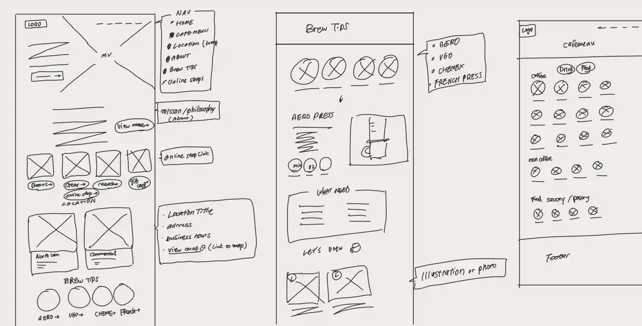 I designed the core 5 pages — Home / Cafe Menu (NEW) / Brew Tips / About / Location / Contact - all in responsive design across 3 devices: Desktop / Tablet / Phone.