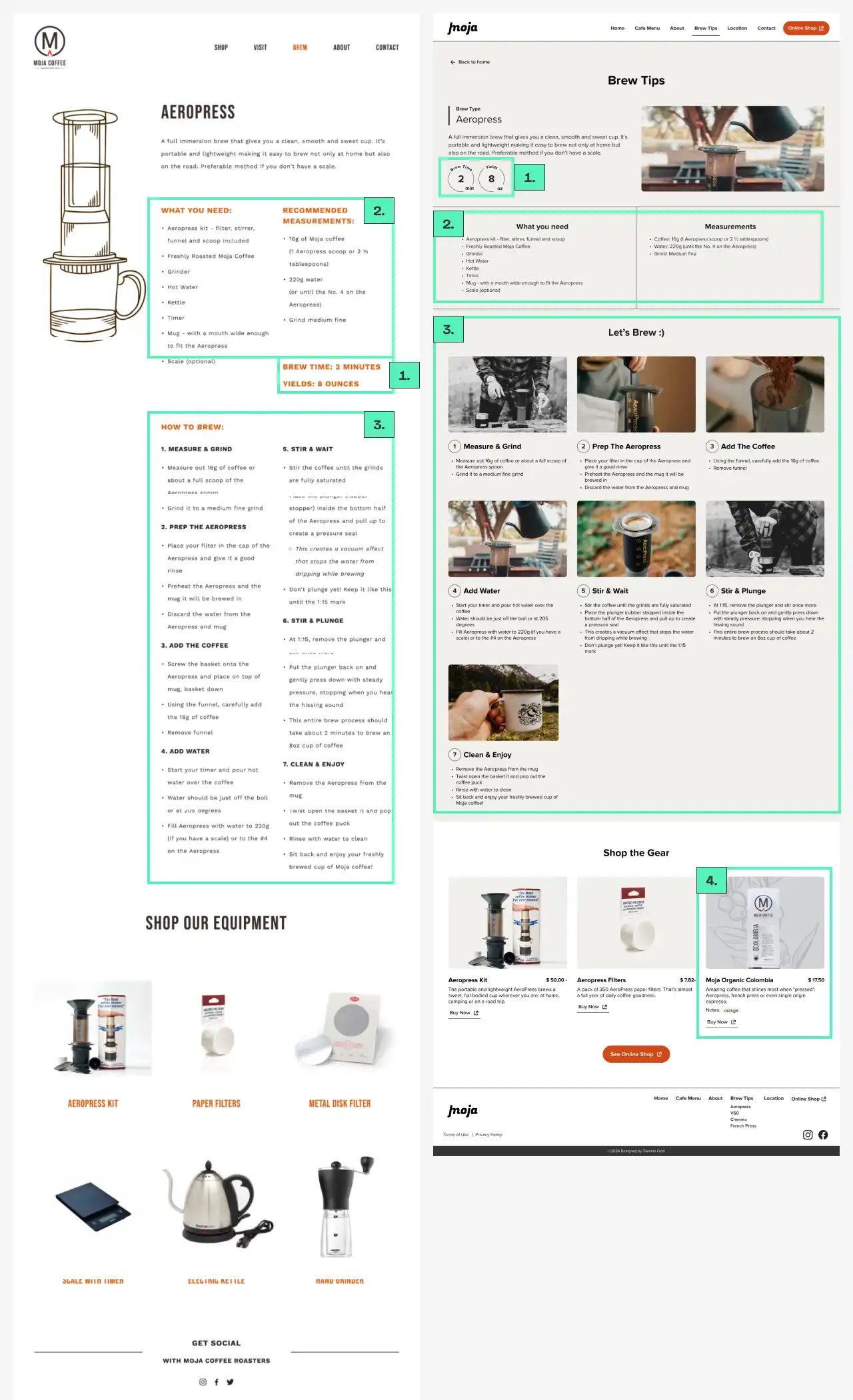 Emphasized visual information over text-based content. Designed with beginners in mind, including step-by-step brewing images to aid understanding. Also, the coffee beans that complement the brewing method were added as a CTA.