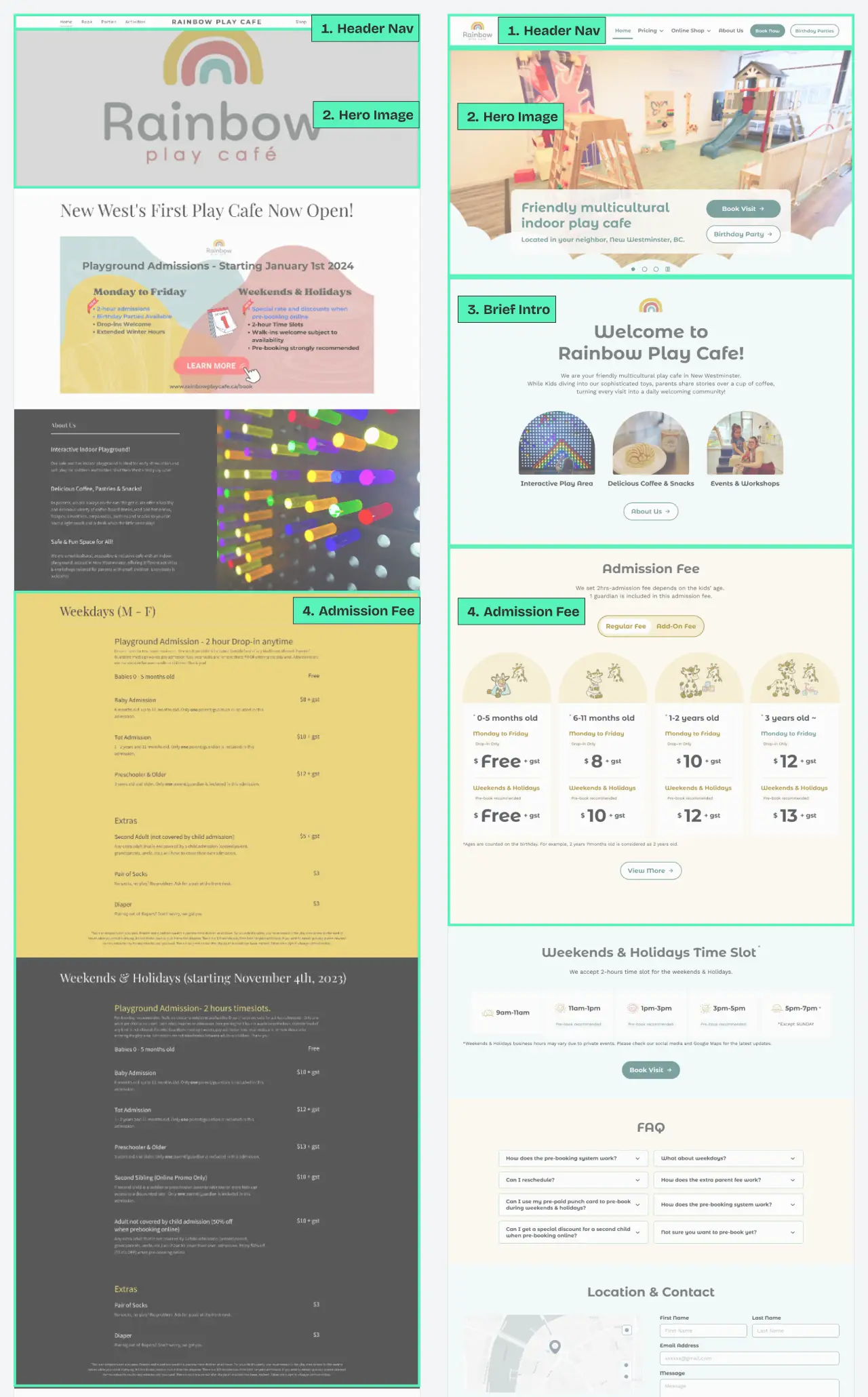 - Header Navigation: "Book" and "Birthday Party" are emphasized as CTA buttons. By implementing a dropdown menu for the sub-menu, the main menu now features only 4menu+2CTA options.