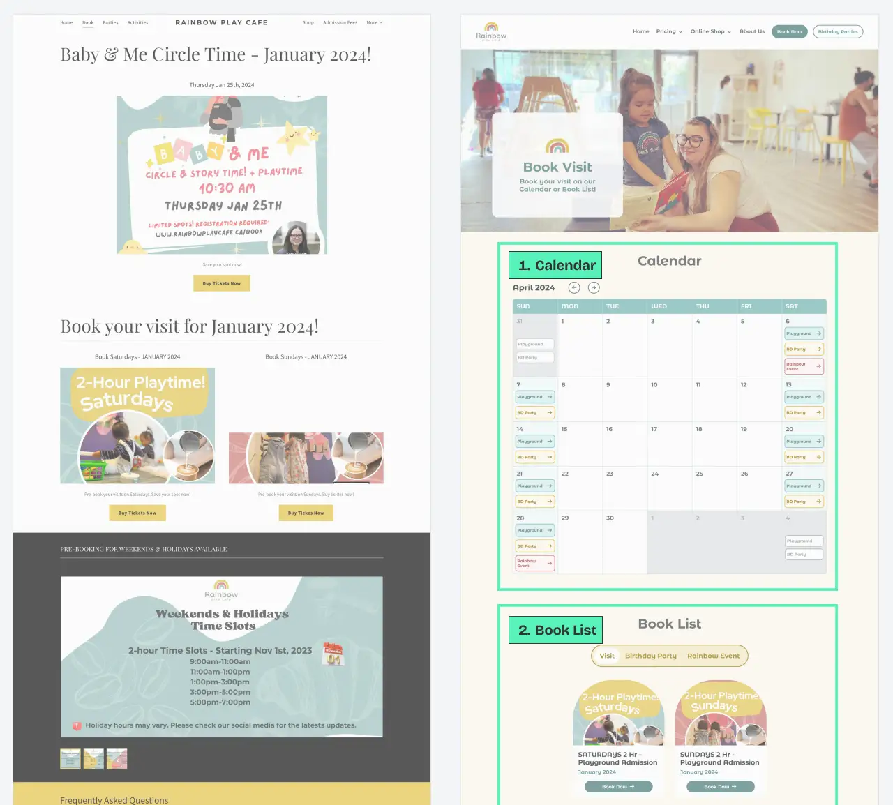 - Book list: All bookable events have been gathered on this page and organized into 3 categories: Regular visits, Birthday parties, and Rainbow Events.